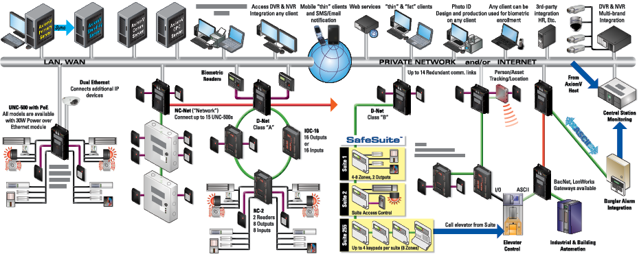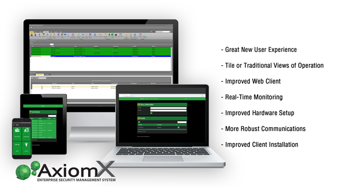AxiomX/AxiomV Enterprise Security Management System for large multi-site/multi-tenant applications, seamlessly integrates Access Control, Alarm Monitoring, and Video Surveillance into an elegant and versatile building management and security system.